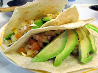 Here’s my fish taco, with a little of Jeremy’s secret spice rub #2 sprinkled on the fish. Garnished with jack cheese, some pineapple salsa, and some sliced avocados. ’twas good!