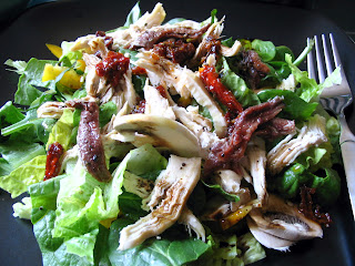Here we have Romaine lettuce, spinach, chicken breast, mushrooms, yellow bell peppers, and sun dried tomatoes. We laid a few fillets of anchovies right on top of the salad and dressed with balsamic vinegar and EVOO.
